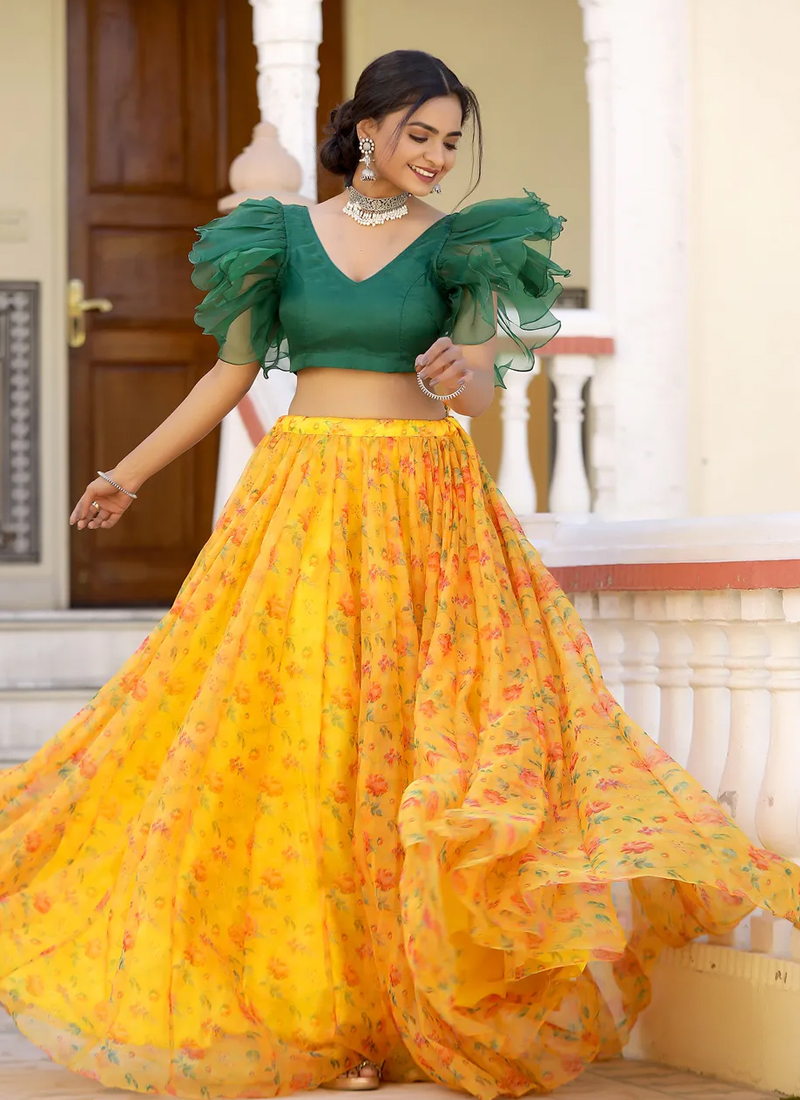 The mustard color Indian lehenga with shantoon lining is exhibited here in all of its vibrant splendor.