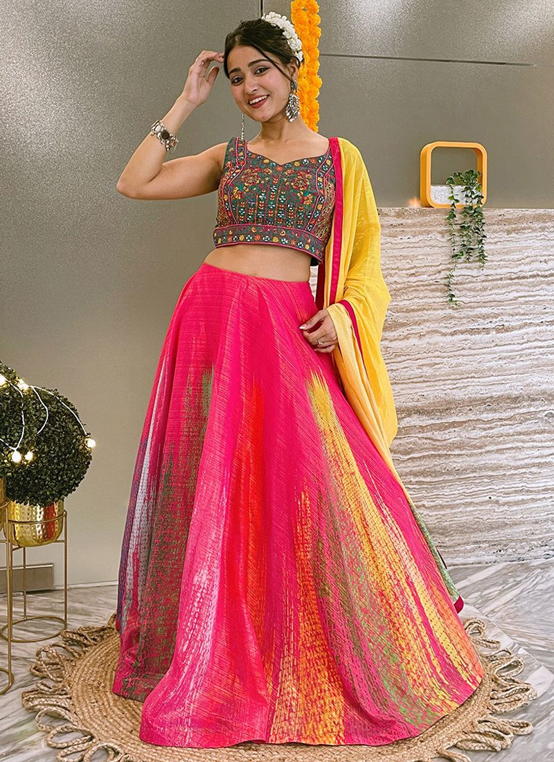 This wedding season let your outfit describe your personality and style. This mustard yellow banglori silk base lehenga choli is a spectacular choice for haldi ceremony. Lehenga choli is dedicately embellished with resham and zari work, whereas dupatta is decorated with beautiful digital print.